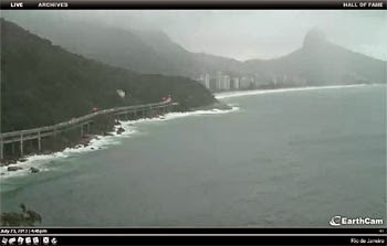Il tempo a Rio de Janeiro non è proprio dei migliori, come potete vedere da questa immagine ripresa oggi alle 16:45 ora di Rio, (ora italiana 21:45). Nonostante ciò il clima che si respira in tutta Rio è estremamente allegro e pieno di aspettative, il che rispecchia il carattere dei brasiliani. Anche gli italiani sono stupiti da questa straordinaria carica positiva della gente, che si sta dimostrando particolarmente ospitale, perfino fraterna.